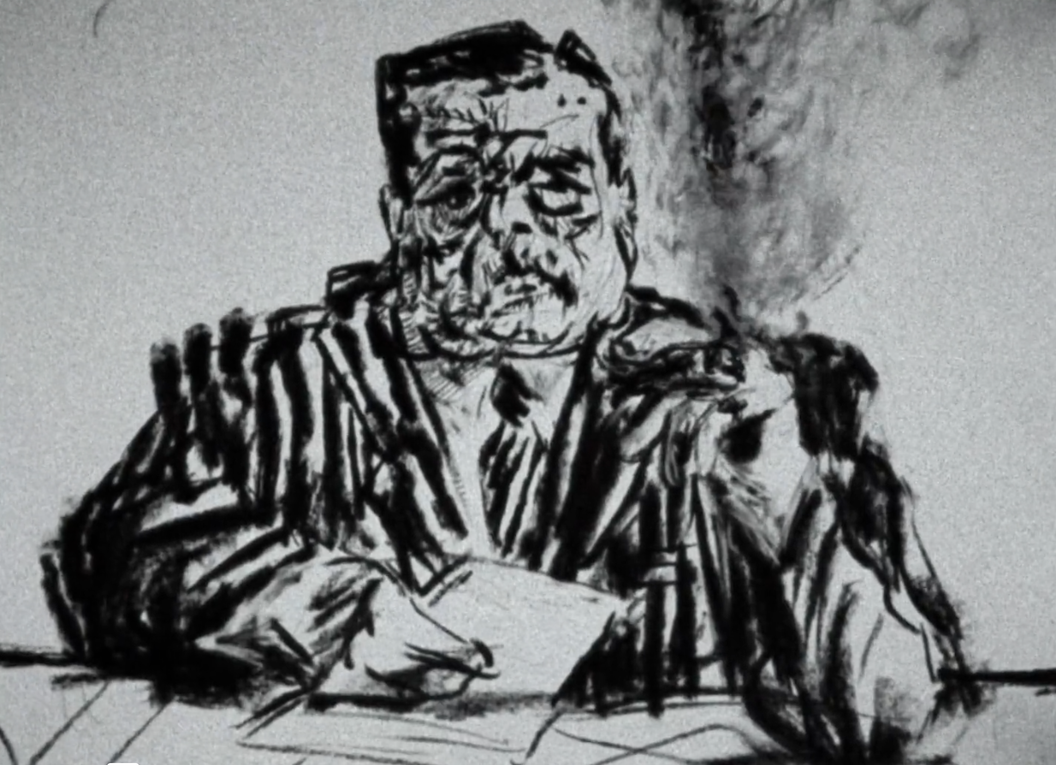 A frame from renowned charcoal animator William Kentridge’s “Johannesburg 2nd Greatest City after Paris.”